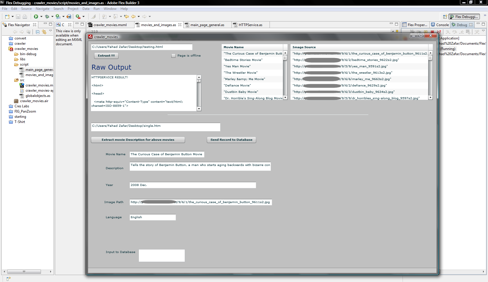 AS3 scraper with regex parsing, SQL Server storage, ASP frontend, and XML web services.